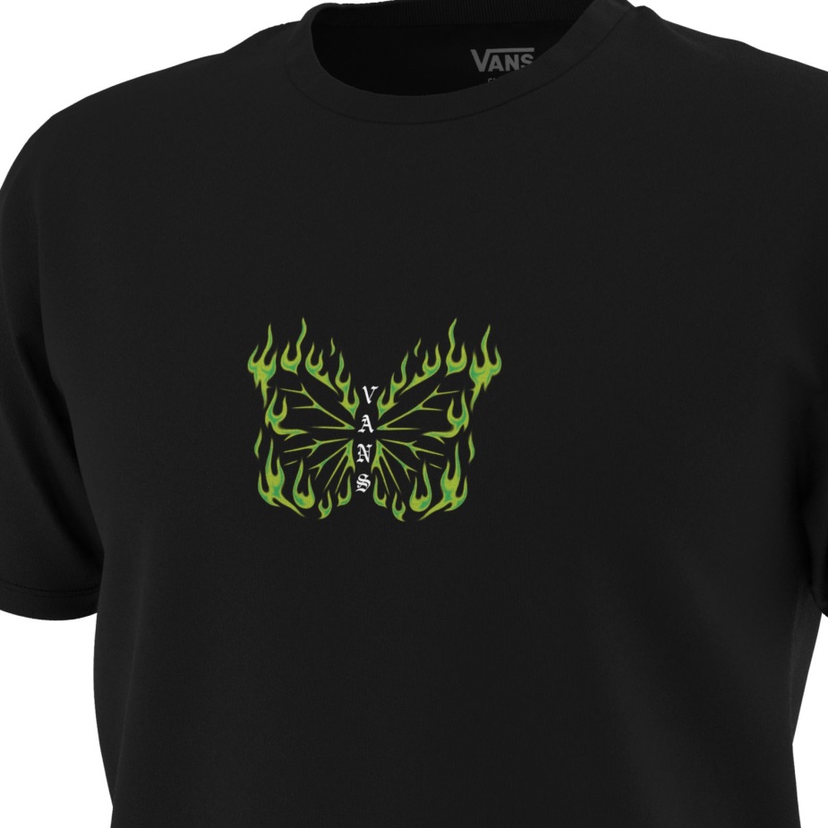 φτιαγμένο με άνετο βαμβάκι, το μπλουζάκι Butterflame έχει κοντά μανίκια και γραφικά πεταλούδας. Το μοντέλο έχει ύψος 6 πόδια και φοράει μεσαίο νούμερο.