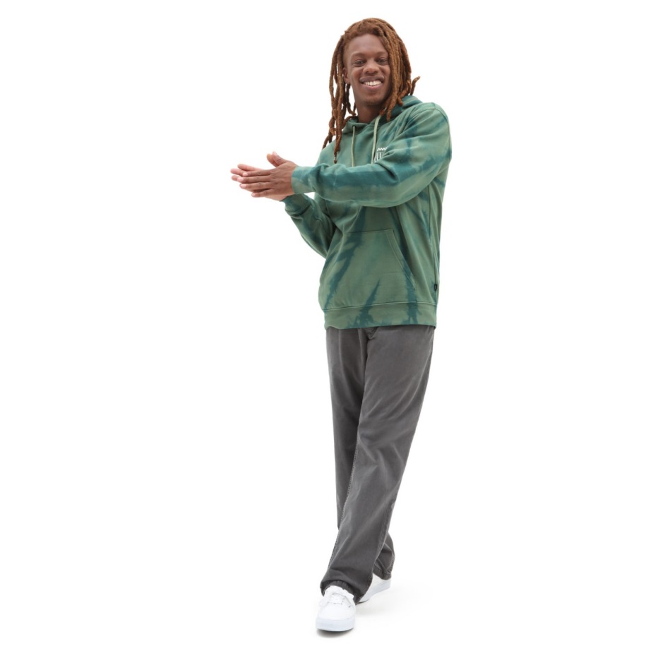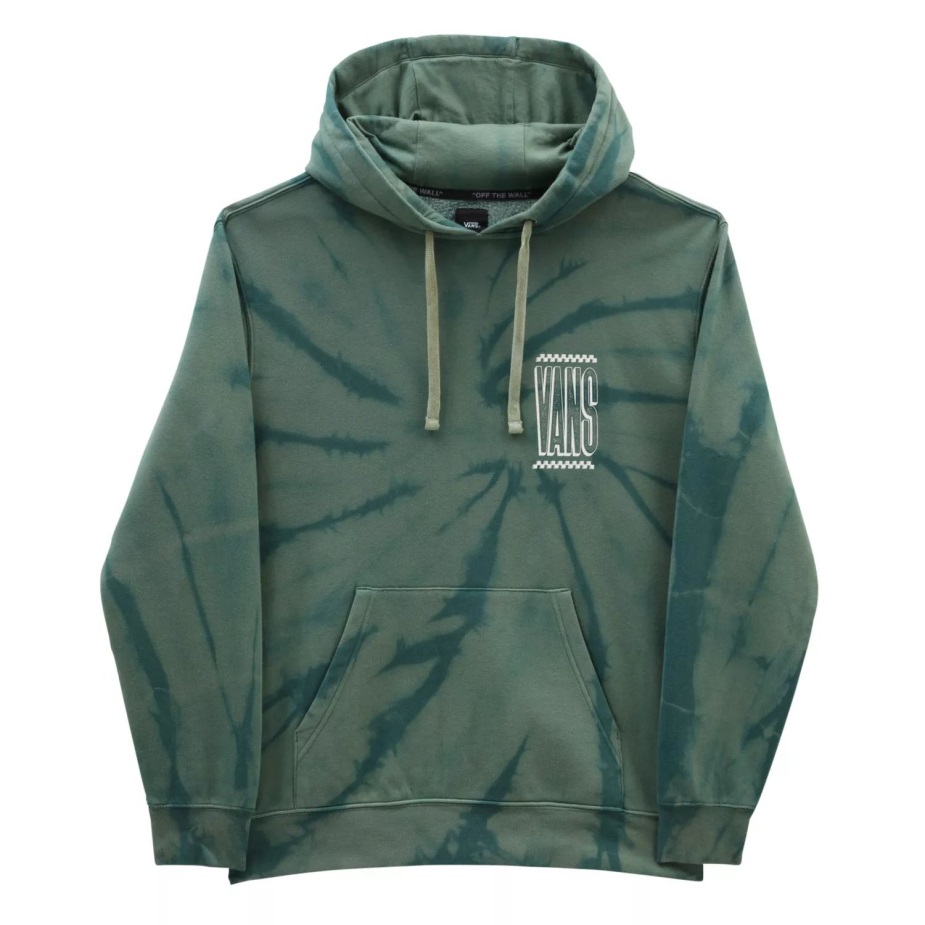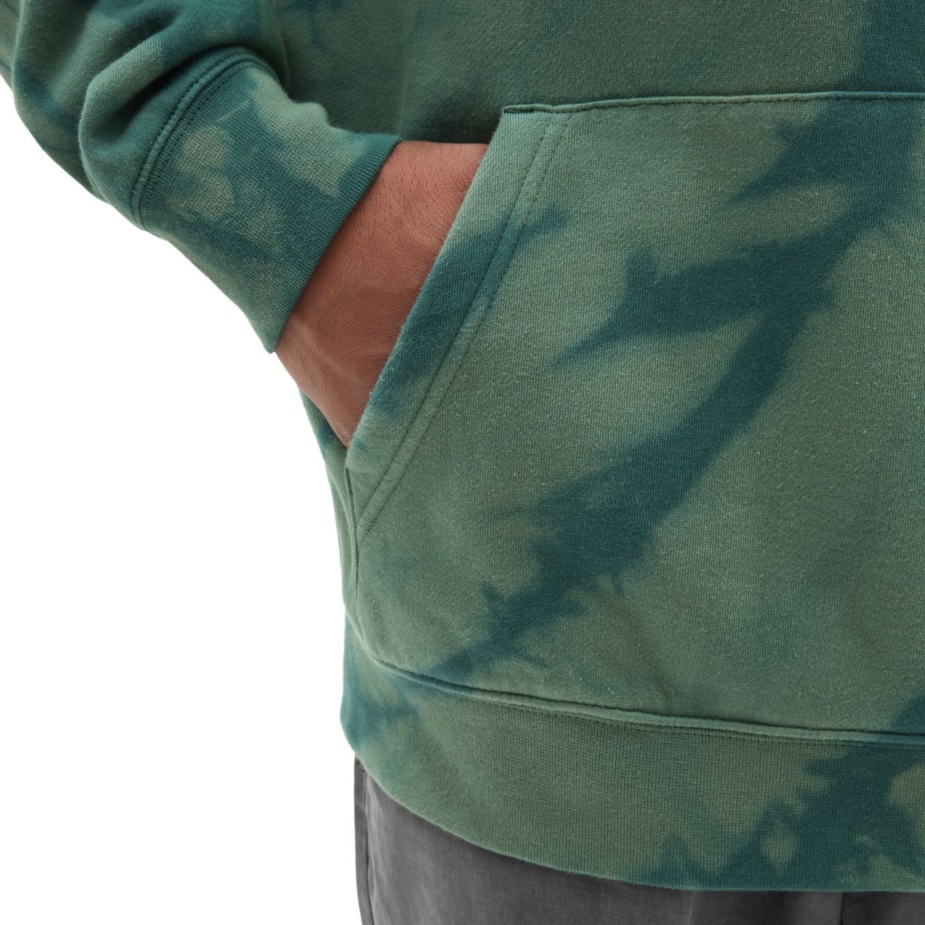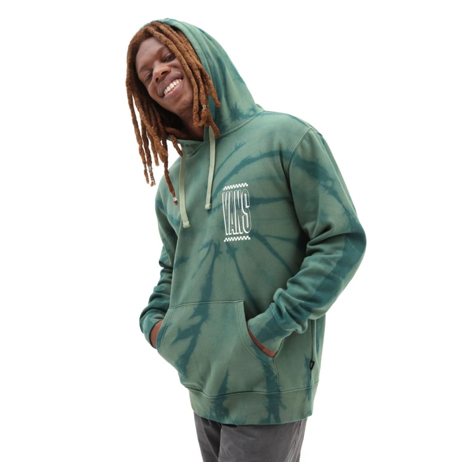 Το ψηλό πουλόβερ τύπου Tie Dye είναι ένα πουλόβερ με κουκούλα από 80% βαμβάκι, 20% πολυεστέρας από Fleece πουλόβερ με πράσινη και γαλαζοπράσινη βαφή, κλασική μπροστινή τσέπη και στάμπες με λογότυπο σκακιέρας στο αριστερό στήθος και την πλάτη.