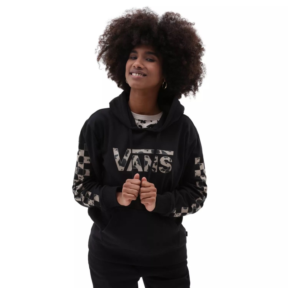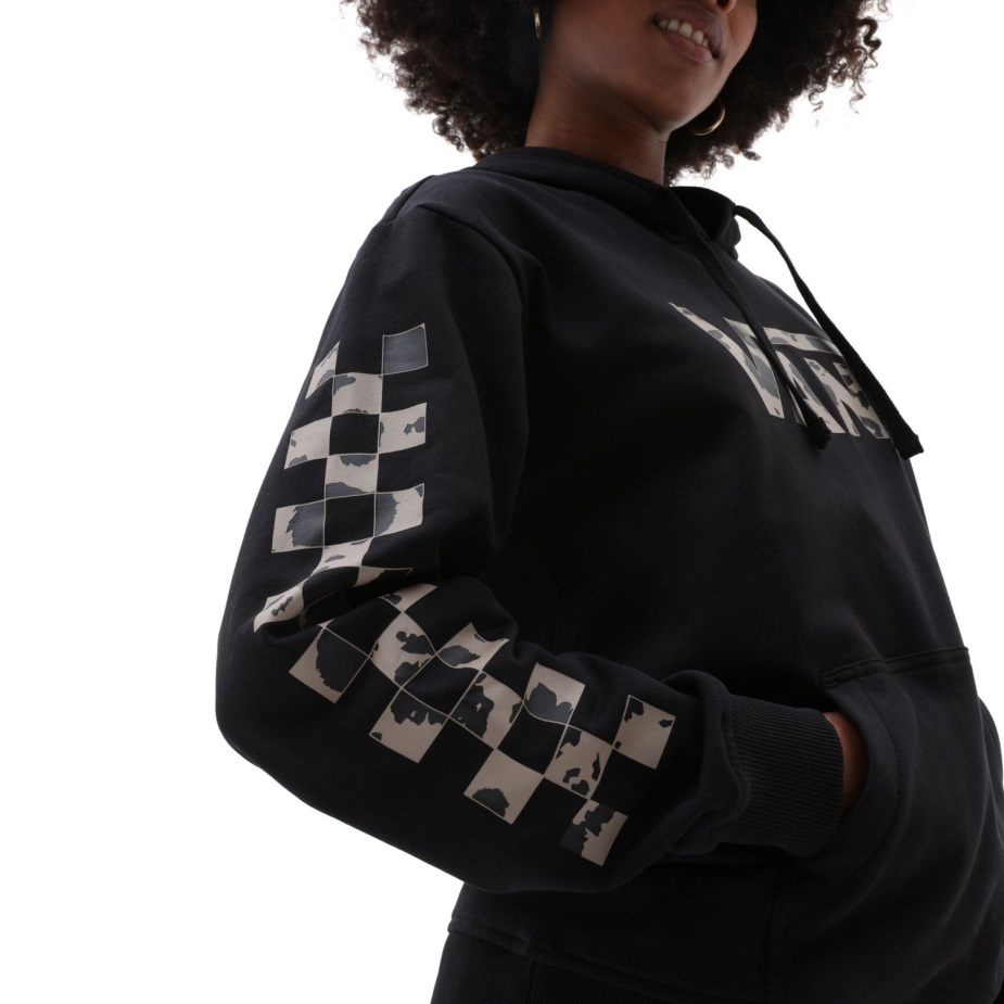 Η κουκούλα με κουκούλα τύπου Vans Dotty Check έχει μακριά μανίκια, μπροστινή τσέπη και το λογότυπο του βαν στο μπροστινό μέρος. έχει επίσης μοτίβο σκακιέρας κάτω και στα δύο μανίκια και έχει εφαρμογή για Boyfriend.