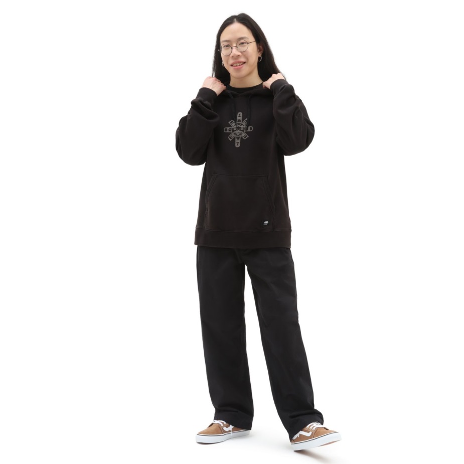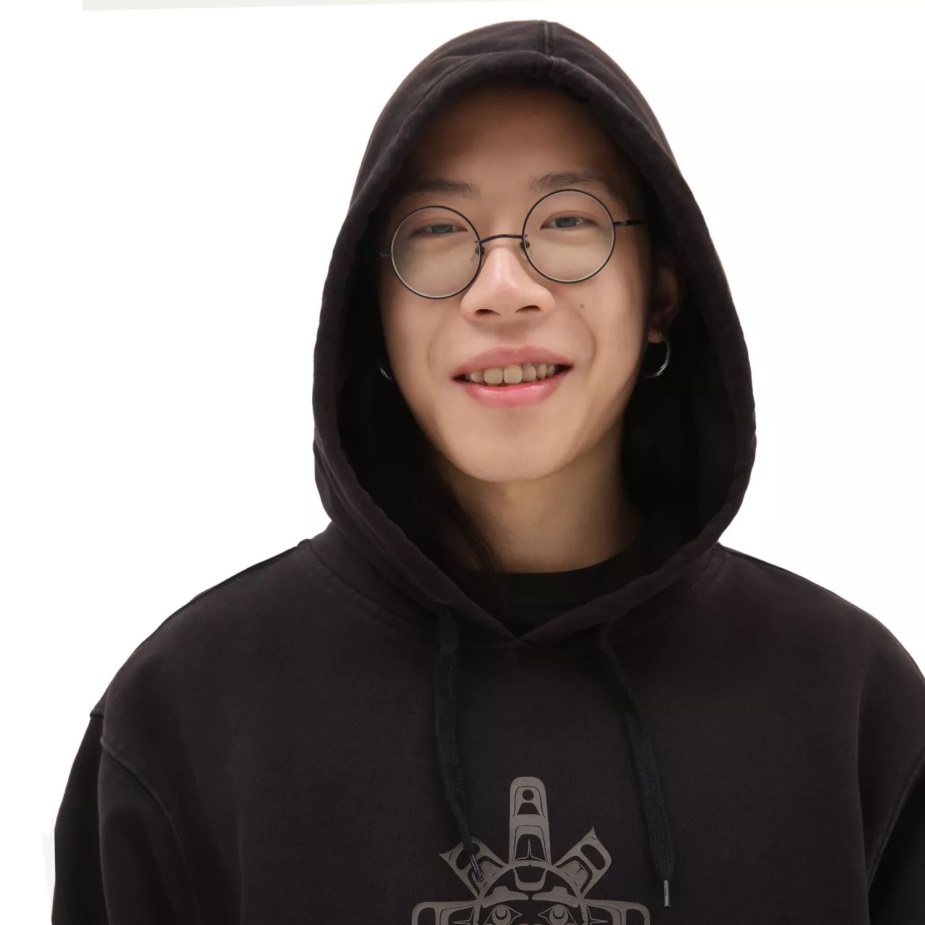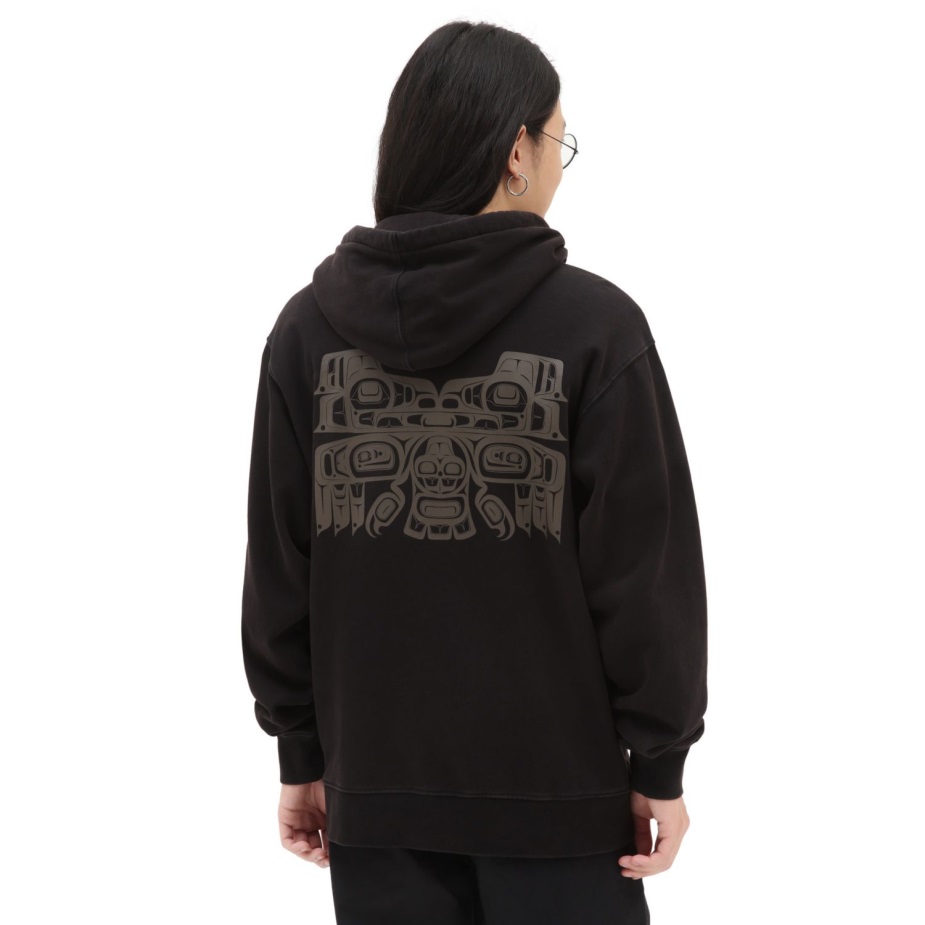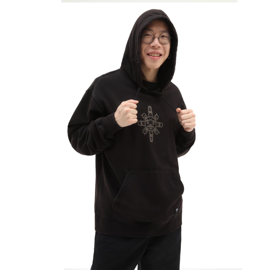 Ο Τζέιμς Τζόνσον δεν είναι μόνο ένας δια βίου τεμαχιστής και διαρκής συνεισφέρων στην κοινότητα του Snowboard, είναι επίσης ένας βραβευμένος καλλιτέχνης και χαράκτης. Γεννημένος και μεγαλωμένος στο Τζούνο της Αλάσκας, ο Τζέιμς ανήκει στη φυλή Tlingit Ch'áak' Dakl'aweidi [φάλαινα δολοφόνος αετών] και η ισχυρή, παραδοσιακή γηγενής ιστορία του τον οδήγησε να ακολουθήσει τη μορφή τέχνης Tlingit για να τιμήσει τους προγόνους του μέσω της δουλειάς του. η ιστορία και η τέχνη που μοιράζεται ο Τζέιμς για αυτή τη μοναδική στο είδος της συλλογή βαν είναι αυτή του κορακιού που φέρνει φως στον κόσμο. Στην ιστορία, το κοράκι κλέβει τον ήλιο από ένα κουτί και τον πετάει επάνω μέσα από τον καπνό και το σκοτάδι για να τον απελευθερώσει στον ουρανό, φωτίζοντας τον κόσμο. Η επιλογή των χρωμάτων για το έργο αντιπροσωπεύει το Tlingit Tináa, το οποίο ήταν φτιαγμένο από χαλκό και σύμβολο πλούτου και θέσης. η κουκούλα με κουκούλα από Fleece James Johnson παρουσιάζει την προσαρμοσμένη τέχνη του James στο στήθος και την πλάτη. Η Vans είναι απίστευτα περήφανη που παρουσιάζει αυτή τη συλλογή James Johnson.