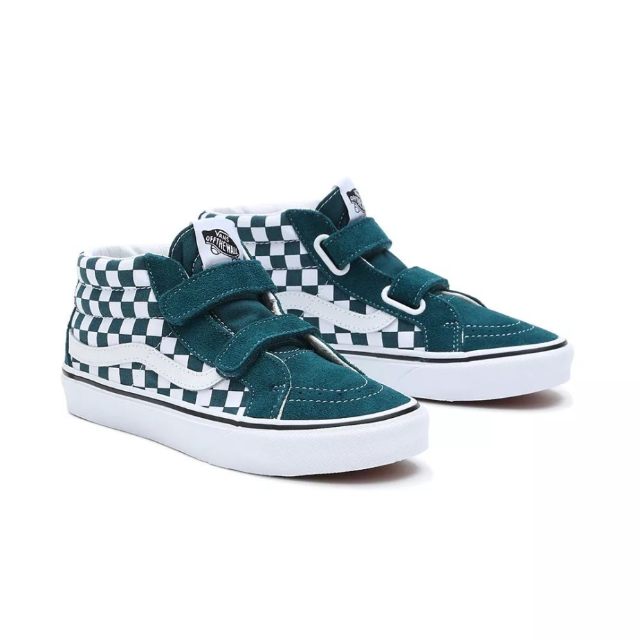 τα παπούτσια Vans Youth Sk8-mid Reissue V είναι ένα μεσαίο παπούτσι με κλείσιμο με γάντζο και βρόχο για εύκολη πρόσβαση σε On-and-off. διαθέτουν επίσης ένα μοτίβο σκακιέρας.