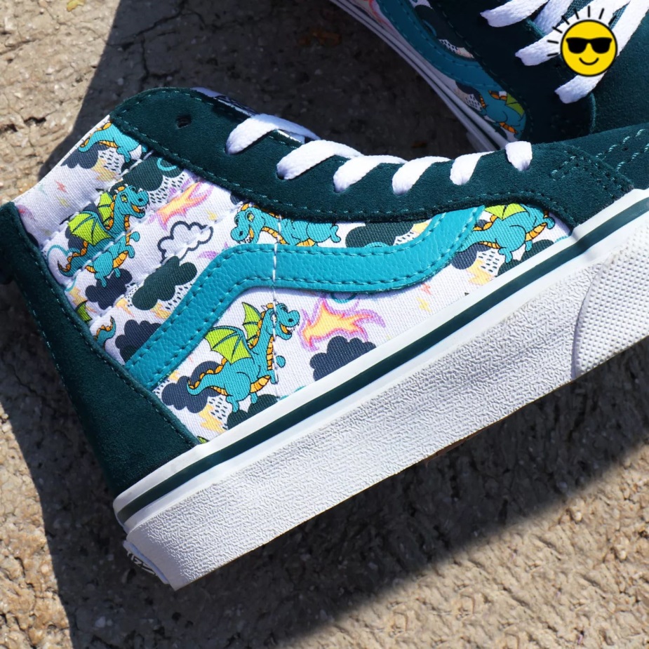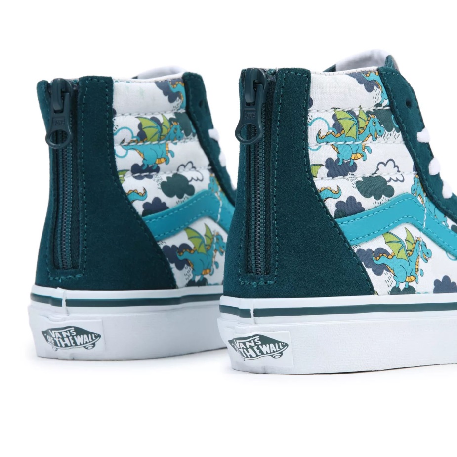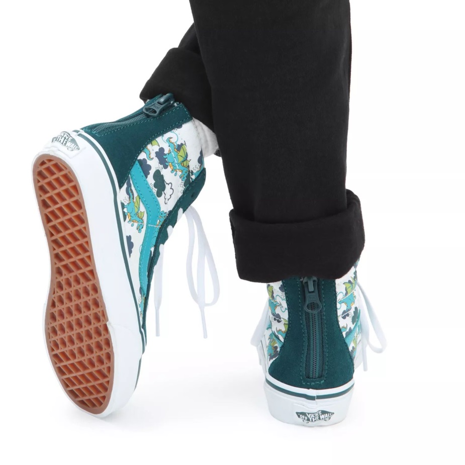 το μυθικό φερμουάρ Sk8-hi λάμψης συνδυάζει το θρυλικό ψηλό μπλουζάκι με κορδόνια με φερμουάρ στη φτέρνα, παρέχοντας αυξημένη πρόσβαση και ευελιξία. μαζί με ανθεκτικό πάνω μέρος από σουέτ και καμβά με εντυπωσιακή στάμπα δράκου που χρησιμοποιεί μελάνι Uv για μαγική λάμψη, αυτό το κλασικό στιλ πλαϊνής λωρίδας είναι εξοπλισμένο με υποστηρικτικούς γιακάς με επένδυση, ενισχυμένα καπάκια στα δάχτυλα και επώνυμες σόλες από καουτσούκ βάφλα.
