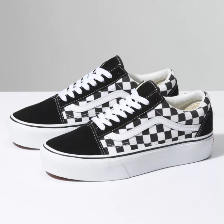 η σκακιέρα παλιά πλατφόρμα Skool συνδυάζει το κλασικό σαλάχι παπούτσι Vans με στιβαρό καμβά και σουέτ επάνω μέρος, το εμβληματικό τύπωμα σκακιέρας Vans, επενδυμένους γιακάδες για στήριξη και ευελιξία και τις χαρακτηριστικές εξωτερικές σόλες από καουτσούκ βάφλας στην πλατφόρμα.