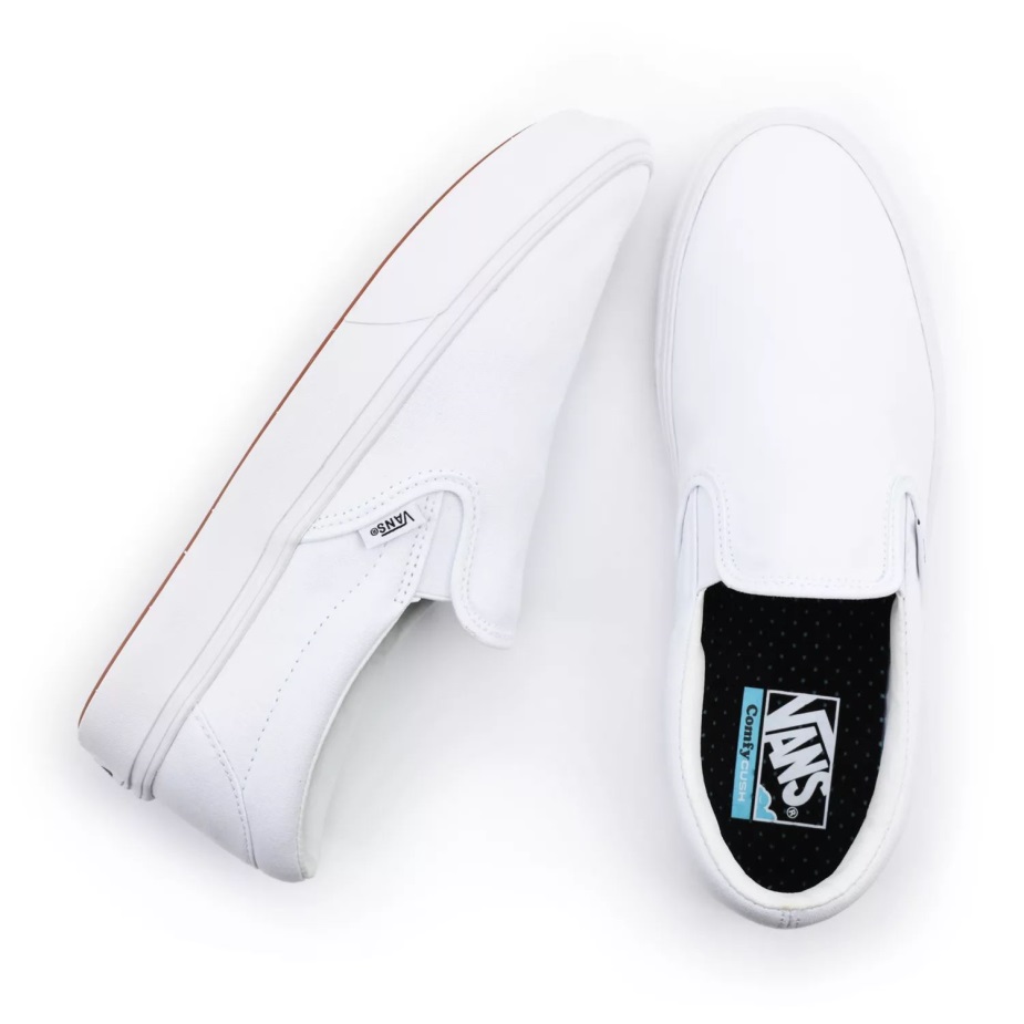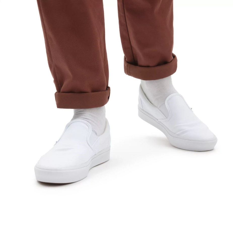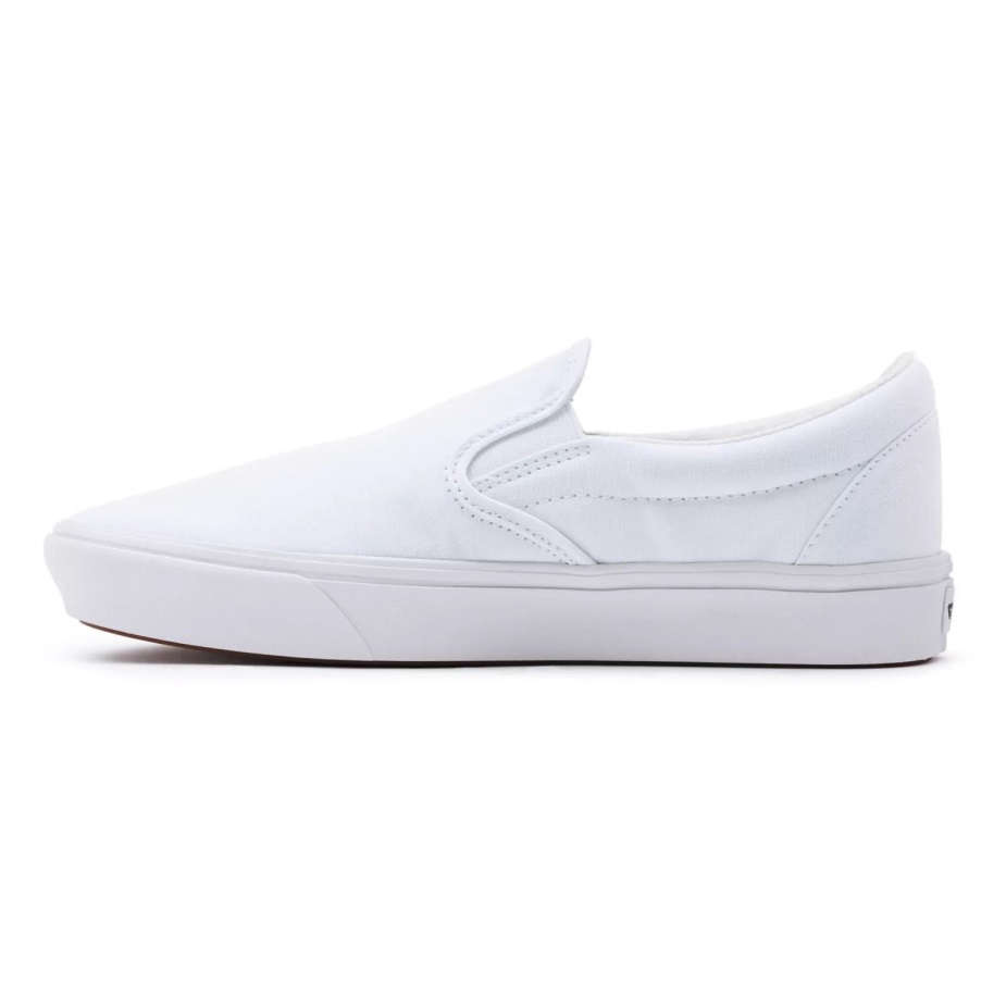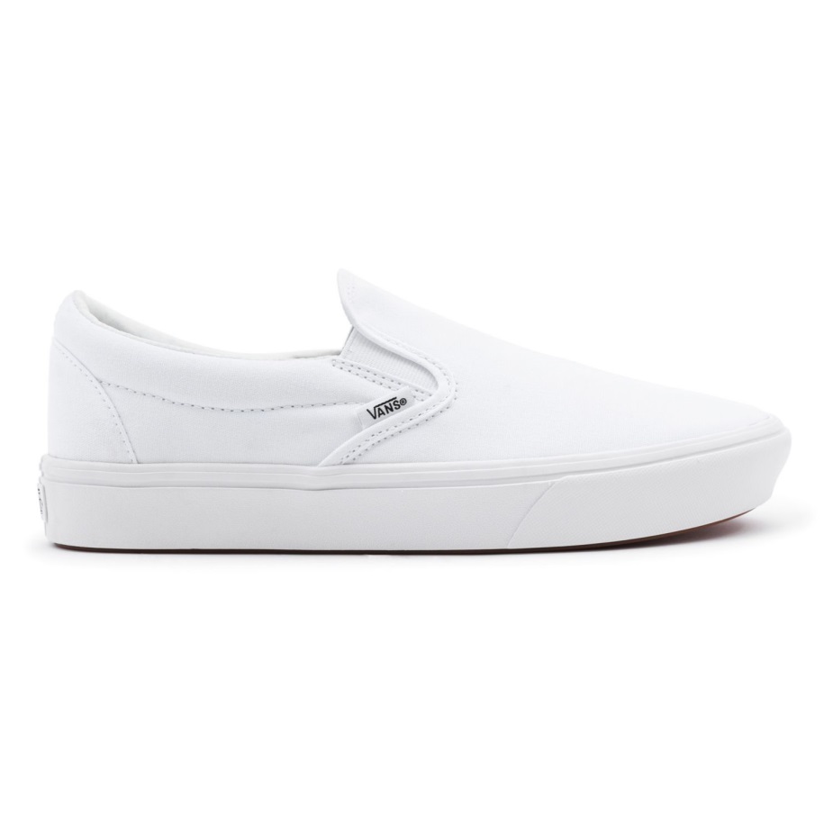 Τα Vans έχουν αναζωογονήσει την κλασική σιλουέτα Slip-on με την τεχνολογία άνεσης Comfycush, δίνοντας στο κλασικό Comfycush Slip-on μια πρώτης τάξεως εφαρμογή που μοιάζει σαν να περπατάς πάνω σε σύννεφο. μια συνδυασμένη κατασκευή αφρού και καουτσούκ είναι ο τέλειος συνδυασμός άνεσης και πρόσφυσης, οι εξωτερικές σόλες από καουτσούκ προσφέρουν ανθεκτικότητα και πρόσφυση, ενώ νέα υλικά επένδυσης που απομακρύνουν την υγρασία εμφανίζονται σε όλο το εσωτερικό του παπουτσιού. ενώ το πρόσφατα κατασκευασμένο επάνω μέρος από καμβά 6 ουγκιών επικεντρώνεται στη σταθεροποίηση της γλώσσας, οι απλοποιημένοι μονοκόμματοι εσωτερικοί χώροι και η πρόσθετη υποστήριξη καμάρας παρέχουν μια εμπειρία όπου η άνεση είναι ζωτικής σημασίας.