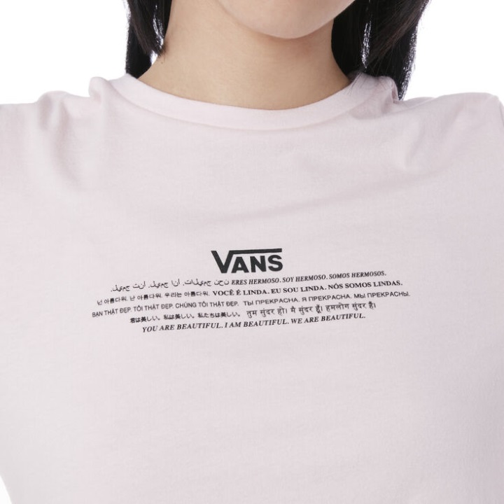 είμαστε όμορφοι. είσαι όμορφη. ειμαι ομορφη. είμαστε όμορφοι - μέσα και έξω. Ως μέρος αυτής της συλλογής, το T-shirt Vans X We are Beautiful είναι ένα κοντομάνικο αθλητικό μπλουζάκι με λαιμόκοψη που σας ενθαρρύνει να υπενθυμίσετε στον εαυτό σας και στους άλλους αυτές τις θετικές επιβεβαιώσεις σε μία από τις 15 διαφορετικές γλώσσες. Το μοντέλο έχει ύψος 5 πόδια 9 ίντσες και φοράει μικρό μέγεθος. - Vans X We are Beautiful συλλογή - 100% βαμβάκι - μπροστινά γραφικά