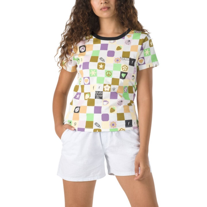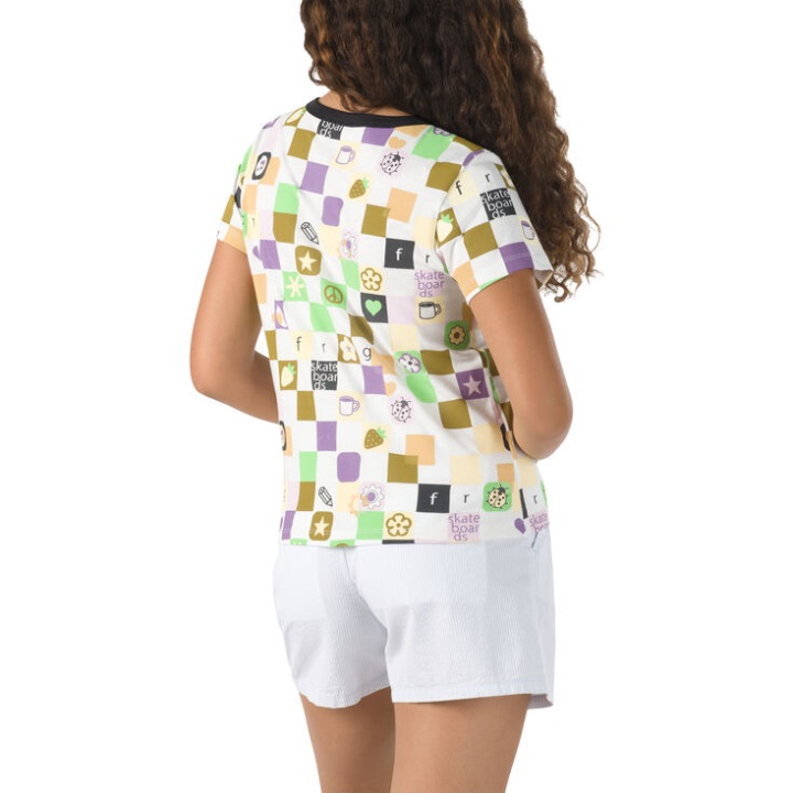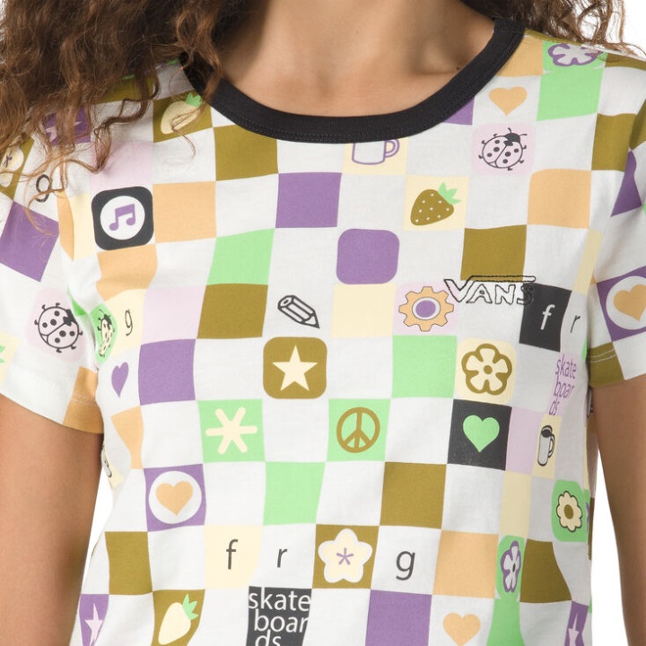 καλλιεργώντας ένα πνεύμα διασκέδασης και συνεργασίας, η ομάδα πίσω από τα Frog Skateboards ενδιαφέρεται για ένα πράγμα πάνω από όλα: να περνάει καλά. Συγκεντρώνοντας μια συλλογή που είναι ταυτόχρονα δημιουργική και περίεργη με τον καλύτερο δυνατό τρόπο, το μωρό μπλουζάκι Vans X Frog είναι κατασκευασμένο από 100% βαμβάκι και διαθέτει στάμπα σκακιέρας που θυμίζει τα Pixelated γραφικά των κλασικών βιντεοπαιχνιδιών. Σε όλο το σχέδιο αυτού του γυναικείου κοντομάνικο μπλουζάκι, μπορούν να εντοπιστούν πολλά Doodles με την υπογραφή βατράχων. Περιλαμβάνει επίσης δέσιμο στον λαιμό με αντίθεση και κέντημα με λογότυπο στο αριστερό στήθος σε σκίτσο βατράχια. Το μοντέλο έχει ύψος 5 πόδια 9 ίντσες και φοράει μικρό μέγεθος.