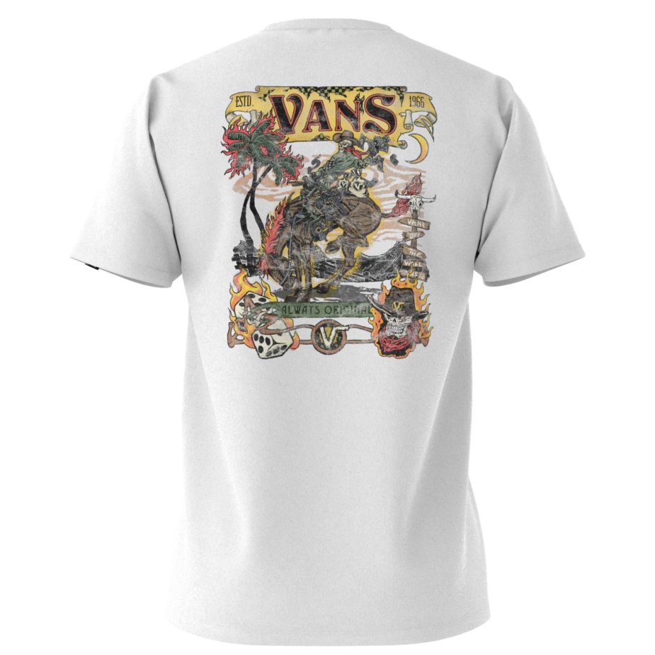 φτιαγμένο με άνετο βαμβάκι, το στραβά μπλουζάκι έχει κοντά μανίκια και σκελετό γραφικά. Το μοντέλο έχει ύψος 6 πόδια και φοράει μεσαίο νούμερο.