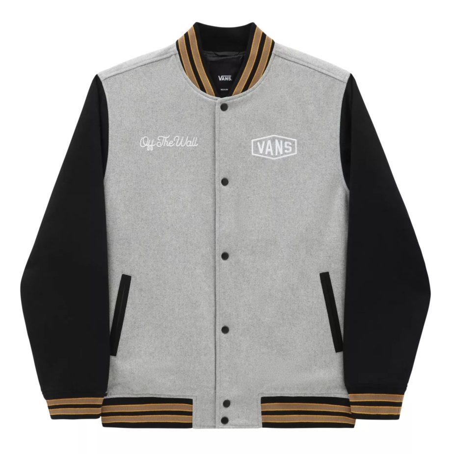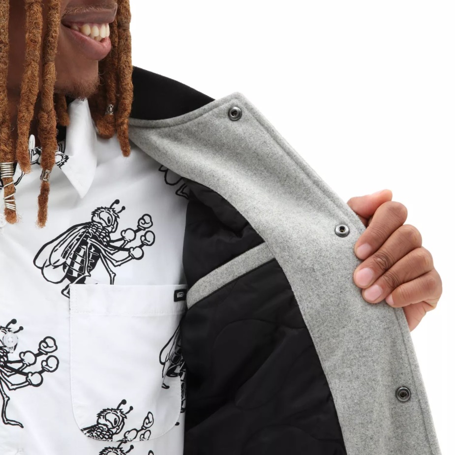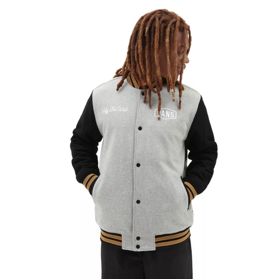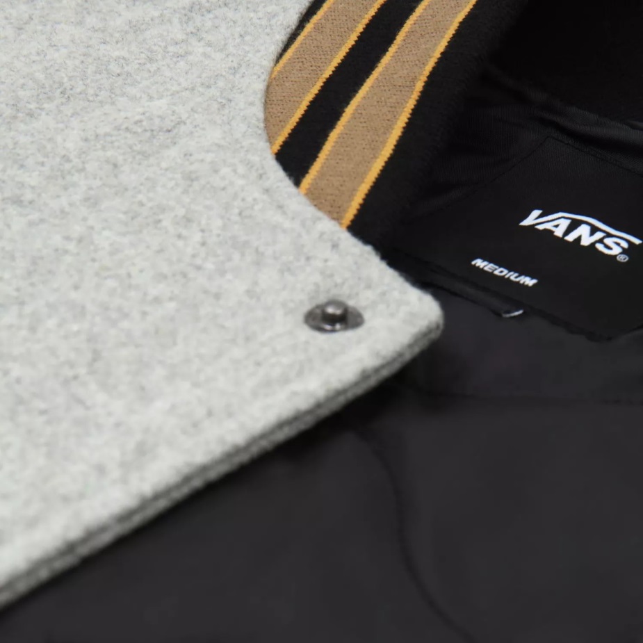 το κλασικό αθλητικό έμπλαστρο σενίλ αναβαθμίζεται από τον τοίχο στο σκακιέρας έρευνας πανεπιστημιακού μπουφάν, ένα ρετρό εμπνευσμένο μάλλινο μπουφάν πανεπιστημίου με κεντημένα λογότυπα στο μπροστινό μέρος. Οι ριγέ ραβδώσεις στο λαιμό, το στρίφωμα και οι μανσέτες προσθέτουν στην αθλητική αισθητική, ενώ η μπροστινή πατιλέτα με κουμπιά και οι τσέπες με σχισμή στους γοφούς διατηρούν την κλασική εμφάνιση.