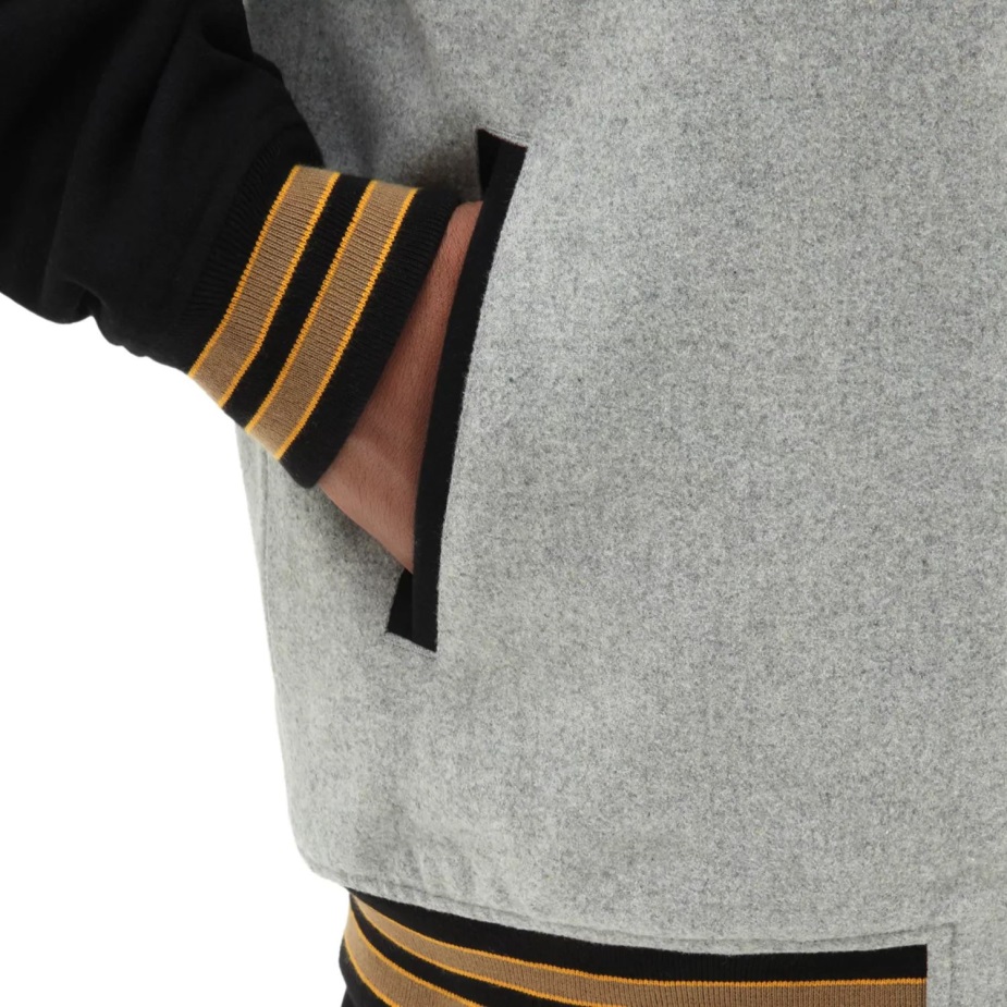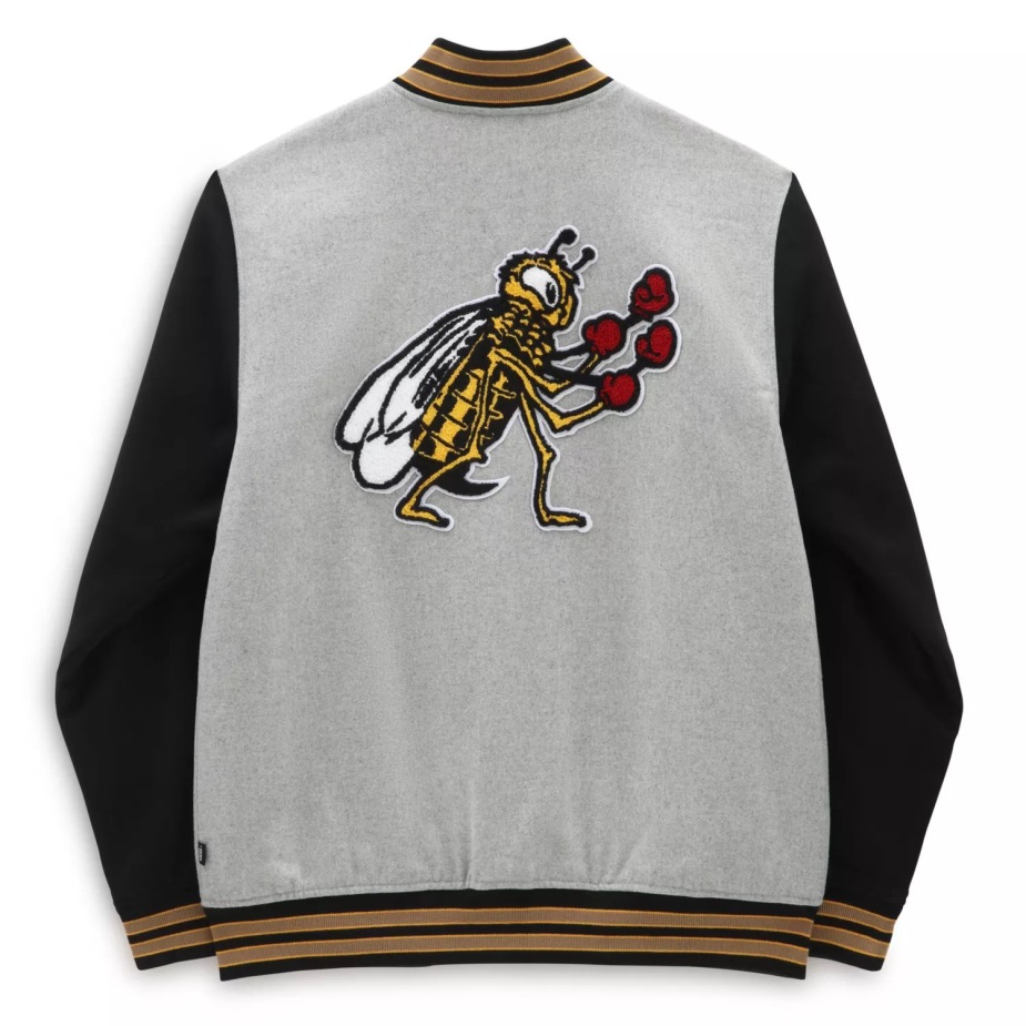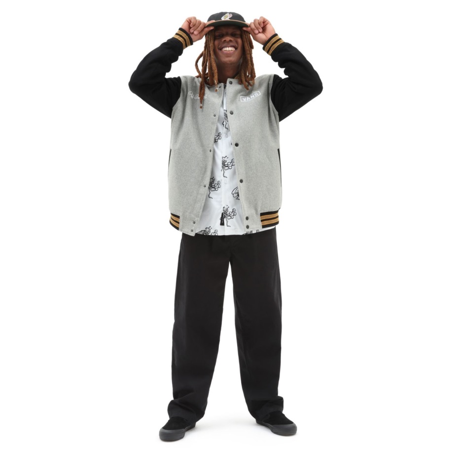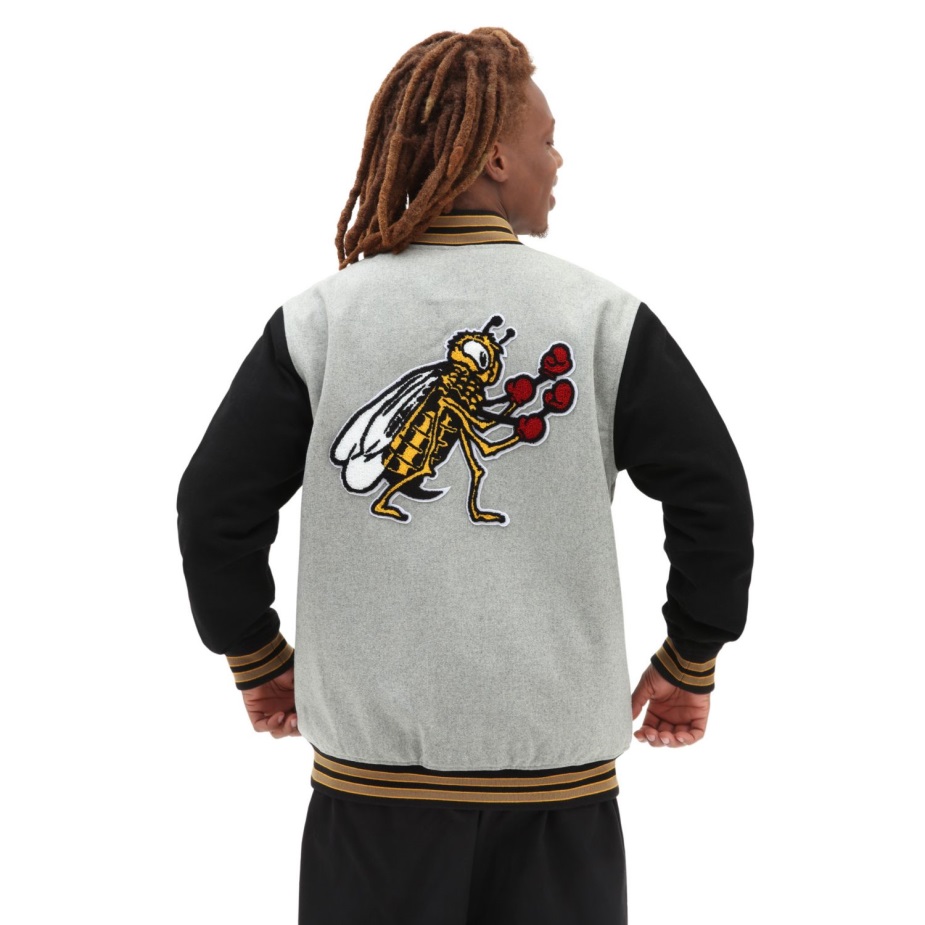 το κλασικό αθλητικό έμπλαστρο σενίλ αναβαθμίζεται από τον τοίχο στο σκακιέρας έρευνας πανεπιστημιακού μπουφάν, ένα ρετρό εμπνευσμένο μάλλινο μπουφάν πανεπιστημίου με κεντημένα λογότυπα στο μπροστινό μέρος. Οι ριγέ ραβδώσεις στο λαιμό, το στρίφωμα και οι μανσέτες προσθέτουν στην αθλητική αισθητική, ενώ η μπροστινή πατιλέτα με κουμπιά και οι τσέπες με σχισμή στους γοφούς διατηρούν την κλασική εμφάνιση.