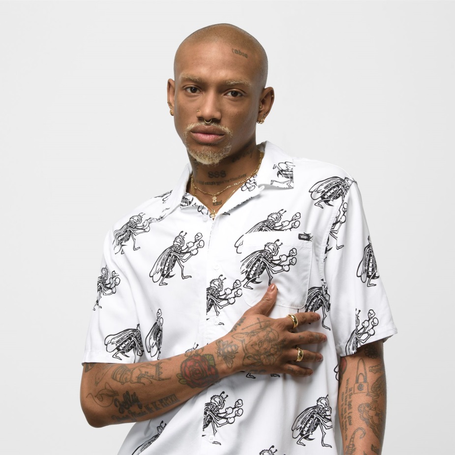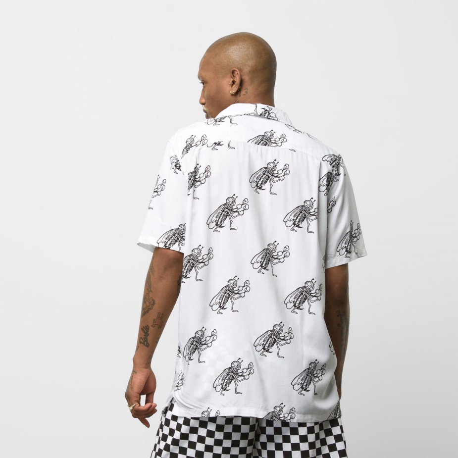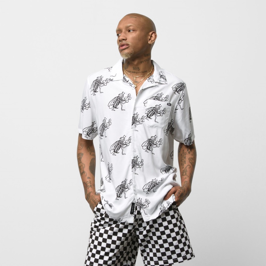 το υφασμένο σκακιέρα είναι ένα πουκάμισο με κουμπιά από 100% βισκόζη με κοντό μανίκι, κλασική αριστερή τσέπη στο στήθος και εμπριμέ μποξ μελισσών. Το μοντέλο έχει ύψος 6 πόδια και φοράει μεσαίο μέγεθος.