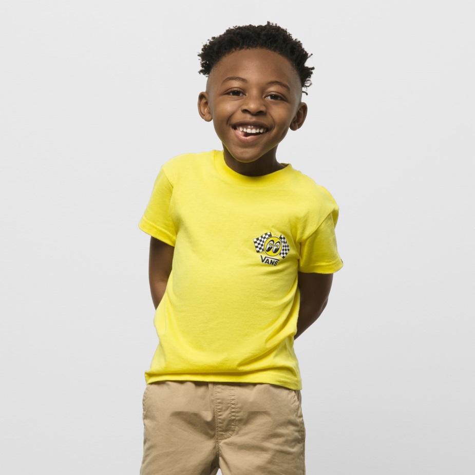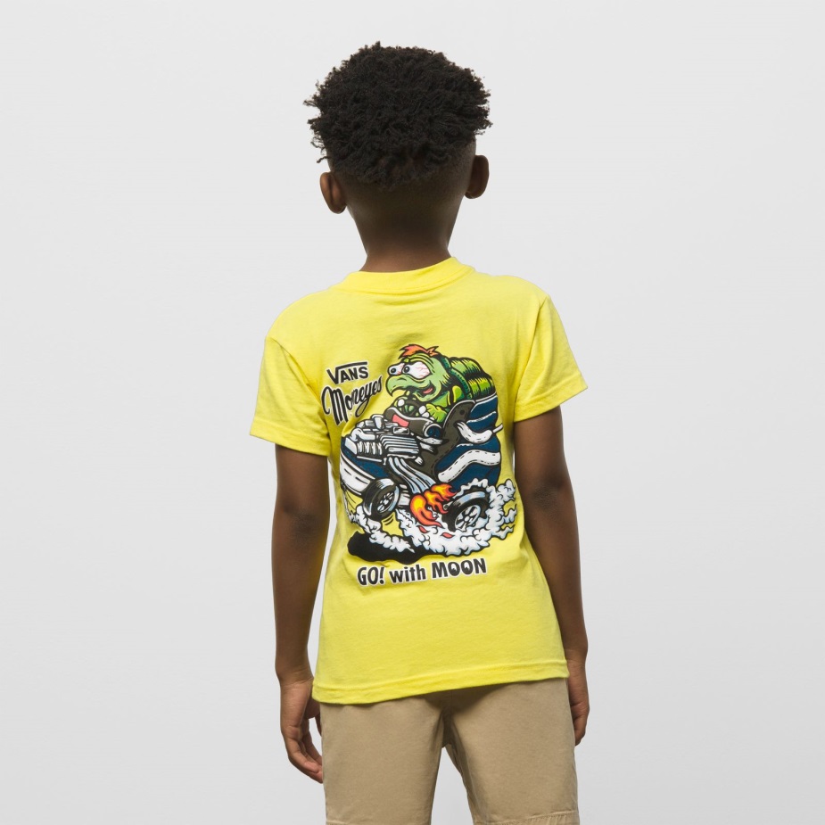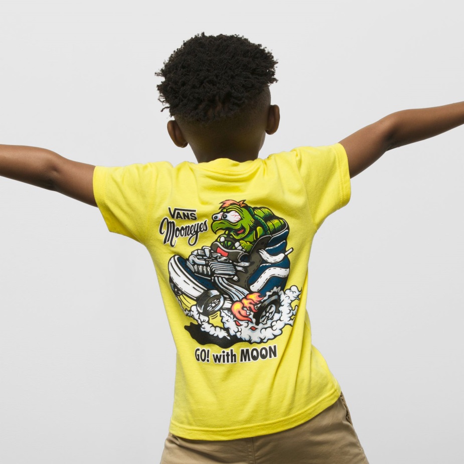 αποτίοντας φόρο τιμής στις ιστορικές ιστορίες τόσο των Vans όσο και των Mooneyes, το παιδικό μπλουζάκι Mooneyes συνδυάζει το εμβληματικό Branding και των δύο εταιρειών με χτενισμένο βαμβάκι και ένα εντυπωσιακό κίτρινο χρώμα. στο πίσω μέρος, μια χελώνα κινουμένων σχεδίων αγωνίζεται με ένα παπούτσι Sk8-hi για ένα πρόσθετο νεύμα στην κληρονομιά μας.