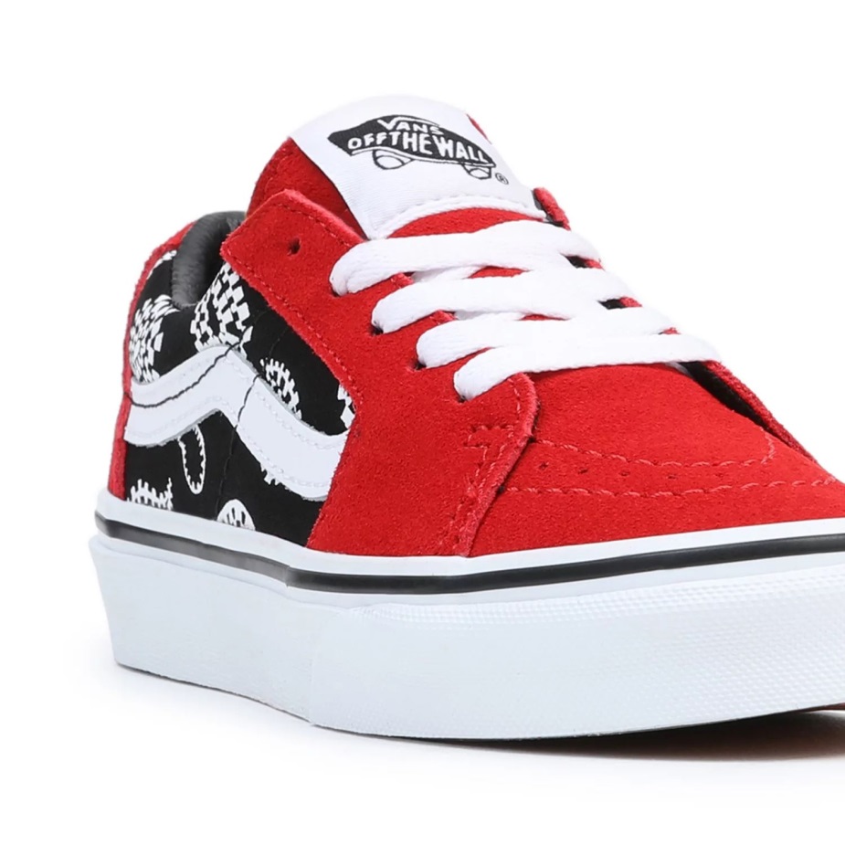το Check Paisley Sk8-low, μια κατάργηση της θρυλικής ψηλής μπλούζας Vans, είναι κατασκευασμένο με ανθεκτικό πάνω μέρος από σουέτ και καμβά και διαθέτει στάμπα που συνδυάζει σχέδια σκακιέρας και Paisley. φέρνοντας μια οικεία αισθητική Sk8-hi σε μια κλασική σιλουέτα χαμηλής κορυφής, αυτό το παπούτσι με κορδόνια αντικατοπτρίζει επίσης το πιο ψηλό του παπούτσι με ενισχυμένα καλύμματα στα δάχτυλα, υποστηρικτικούς γιακάς με επένδυση και σόλες από καουτσούκ βάφλα.