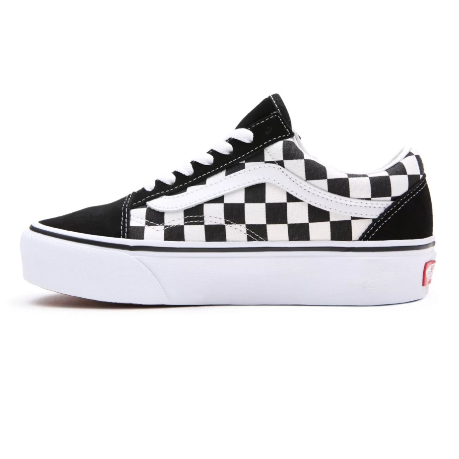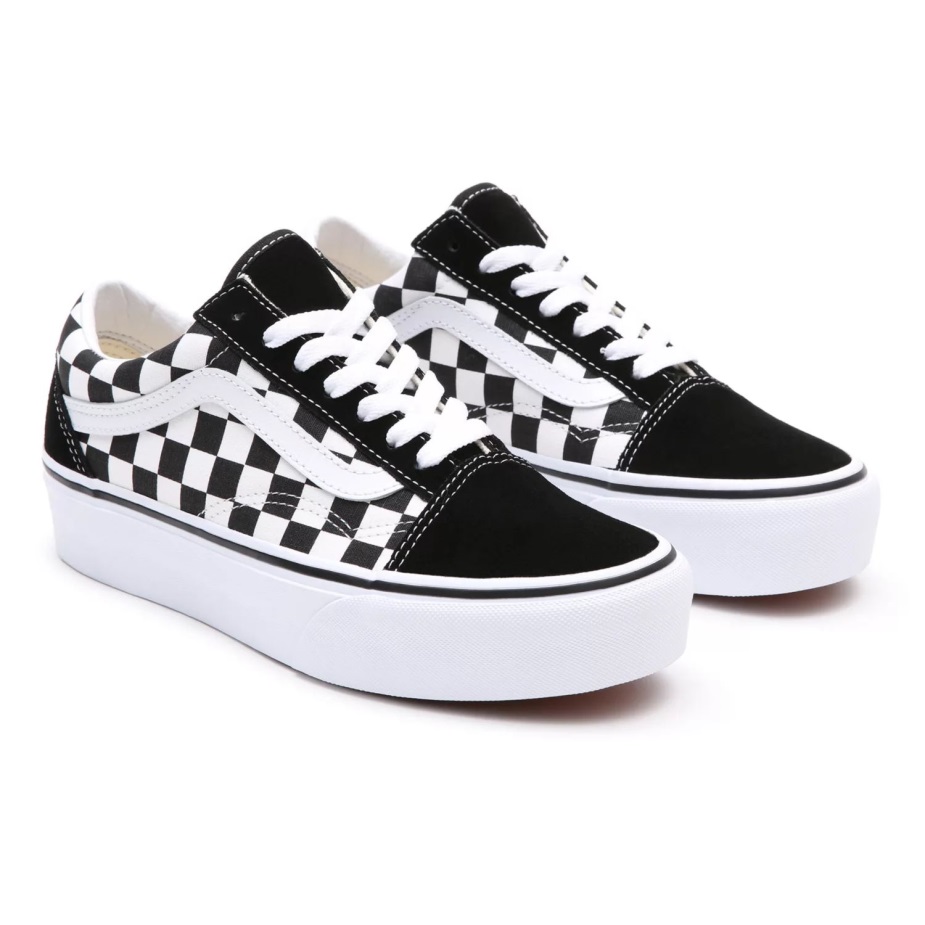 η σκακιέρα παλιά πλατφόρμα Skool συνδυάζει το κλασικό σαλάχι παπούτσι Vans με στιβαρό καμβά και σουέτ επάνω μέρος, το εμβληματικό τύπωμα σκακιέρας Vans, επενδυμένους γιακά για στήριξη και ευελιξία και σόλες από καουτσούκ βάφλας με υπογραφή πλατφόρμας.
