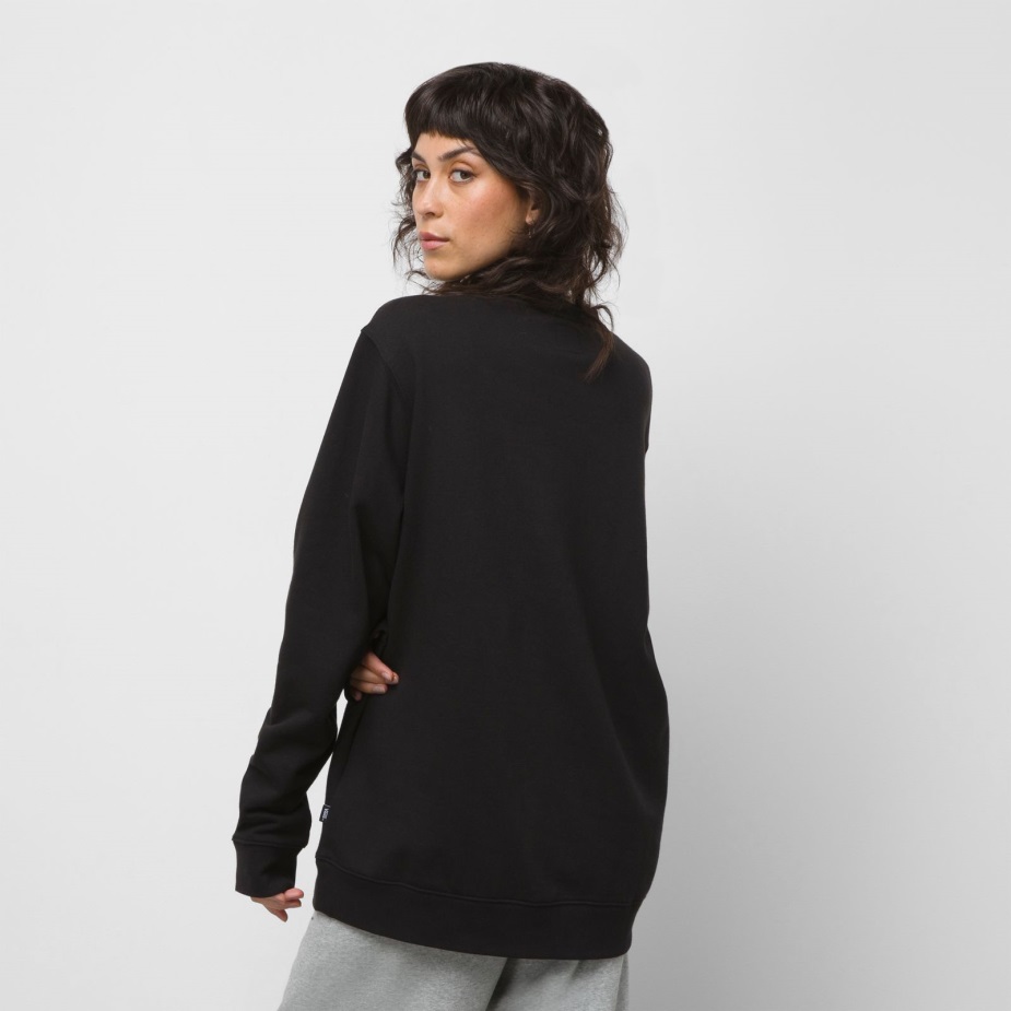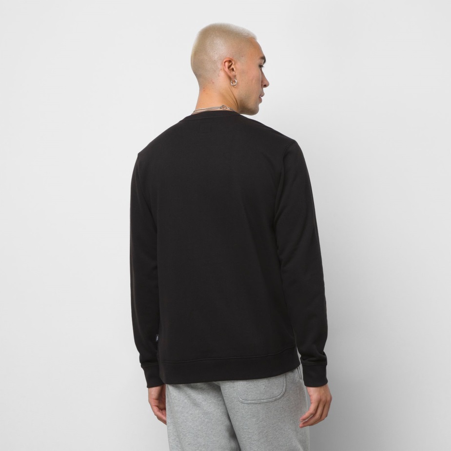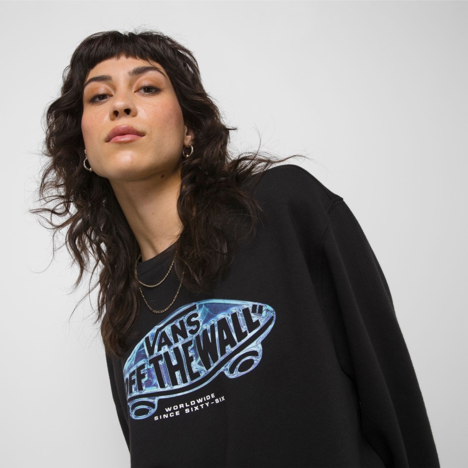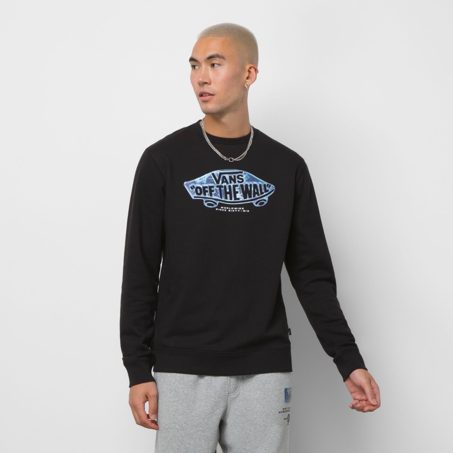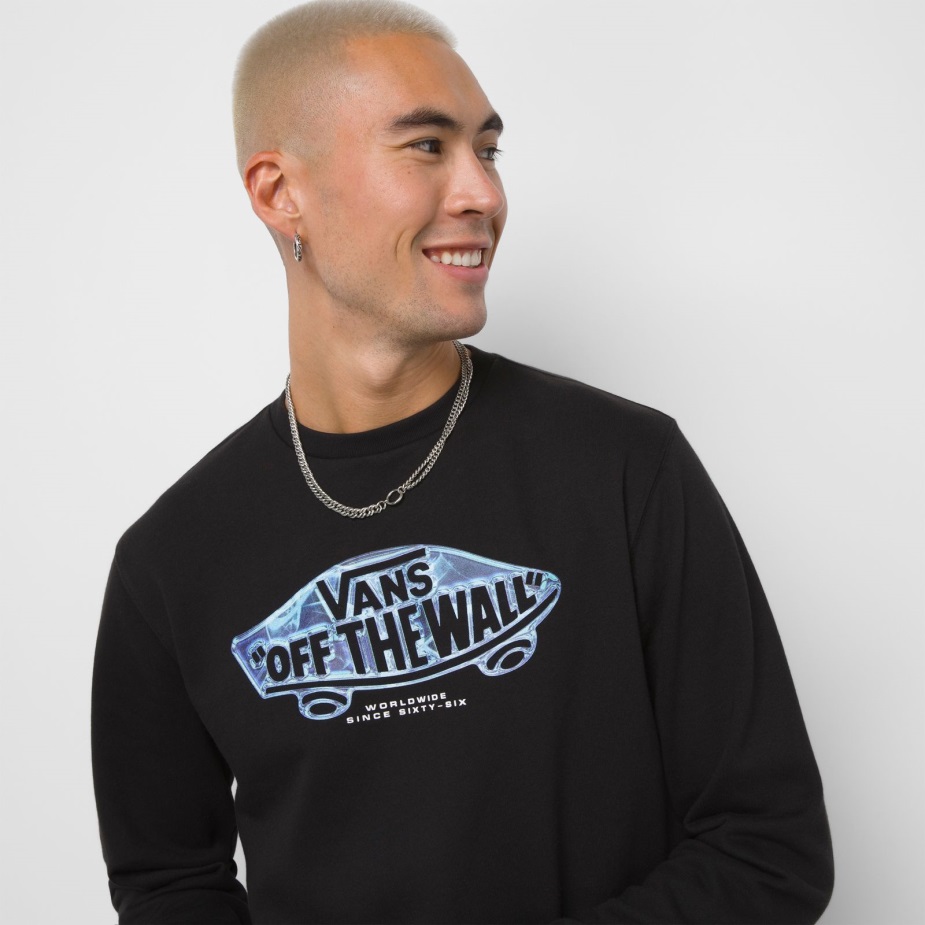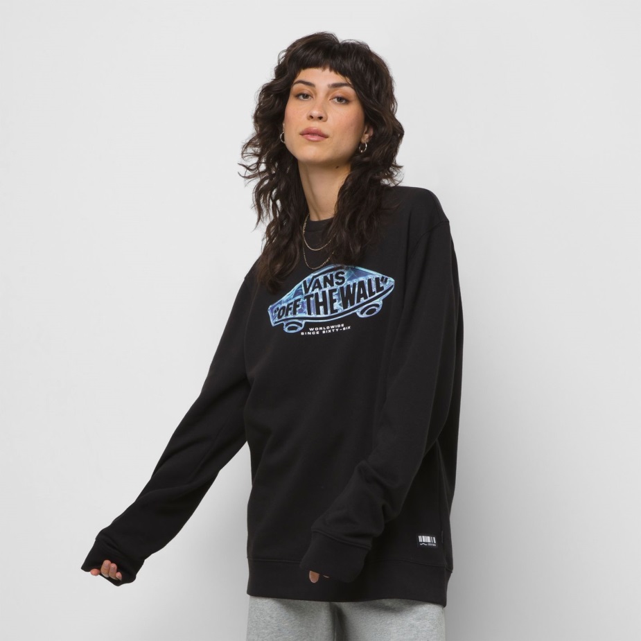 Το κλασικό μας λογότυπο Skateboard "off The Wall" αναβαθμίζεται στο κέντρο του μπροστινού τμήματος του πληρώματος πουλόβερ μετά το σκούρο, ένα φούτερ φλις πουλόβερ με λαιμόκοψη από 60% βαμβάκι και 40% πολυεστέρα. Το μοντέλο έχει ύψος 6 πόδια και φοράει μεσαίο μέγεθος.
