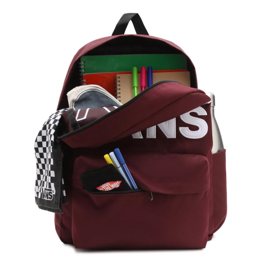Το σακίδιο πλάτης Vans Old Skool Drop V διαθέτει μια μεγάλη κύρια θήκη και έχει επίσης μια μπροστινή τσέπη με φερμουάρ με Organizer για γρήγορη πρόσβαση και μια τσέπη για μπουκάλι νερού. Το λογότυπο του βαν βρίσκεται στο μπροστινό μέρος και οι ιμάντες ώμου με ίσια επένδυση δίνουν σε αυτή την τσάντα επιπλέον άνεση. έχει διαστάσεις 41,9 L X 32,4 W X 12,1 D Cm, έχει χωρητικότητα 22 λίτρων.