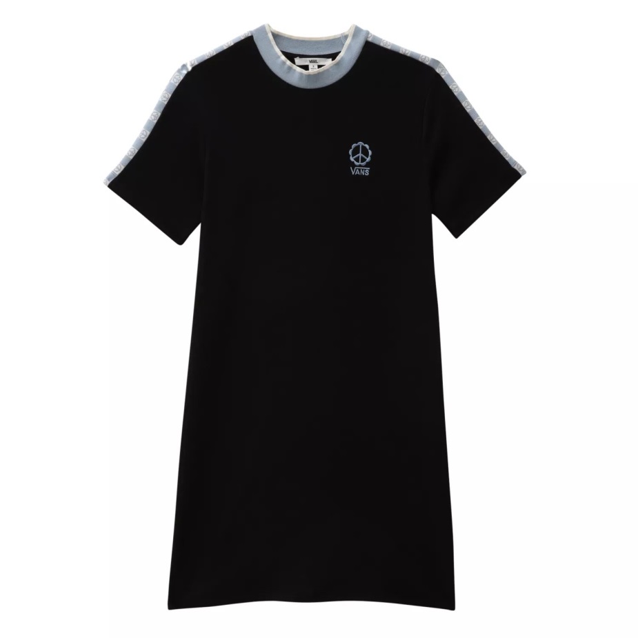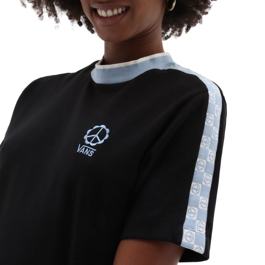 Το φόρεμα σκακιέρας τύπου Vans Peace έχει λαιμόκοψη, κοντά μανίκια και ζακάρ που κόβει τα μπράτσα. Διαθέτει ψηλό λαιμό και το λογότυπο του βαν στο αριστερό στήθος.