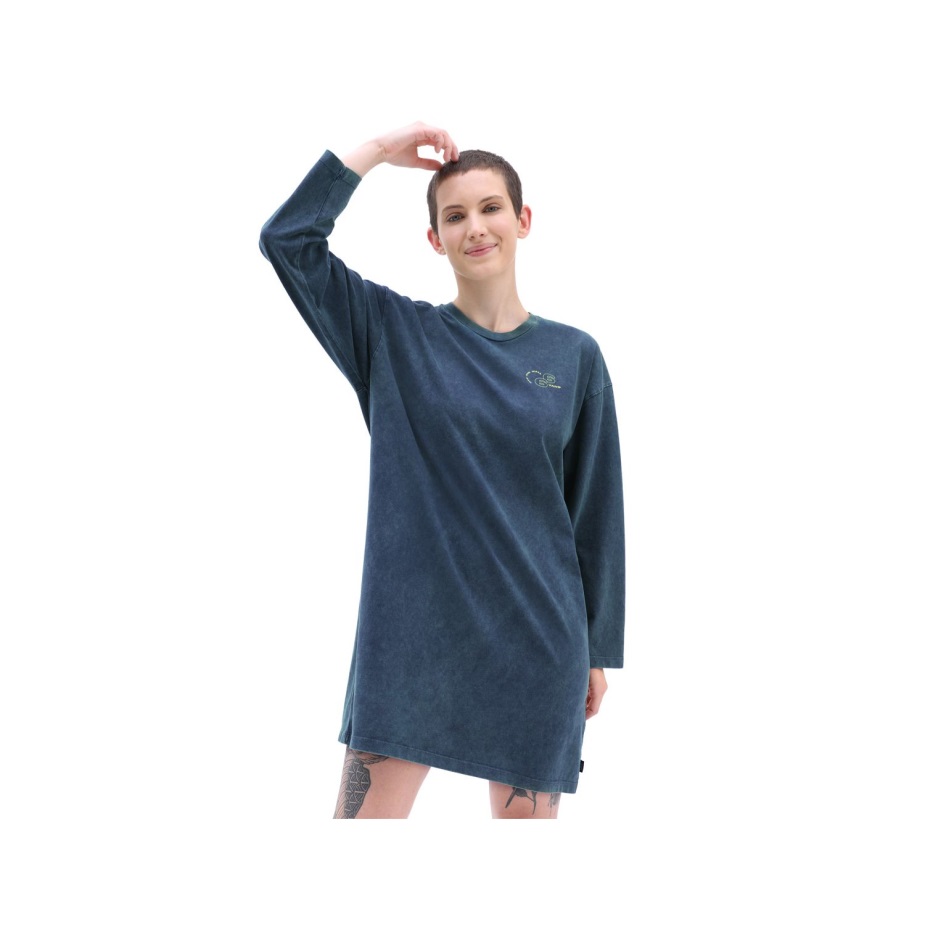 το φόρεμα με μακριά μανίκια Vans Mootoo είναι ένα φόρεμα με μακριά μανίκια με χαλαρή εφαρμογή. έχει λαιμόκοψη, ώμους και το λογότυπο του φορτηγού στο αριστερό στήθος και την πλάτη.