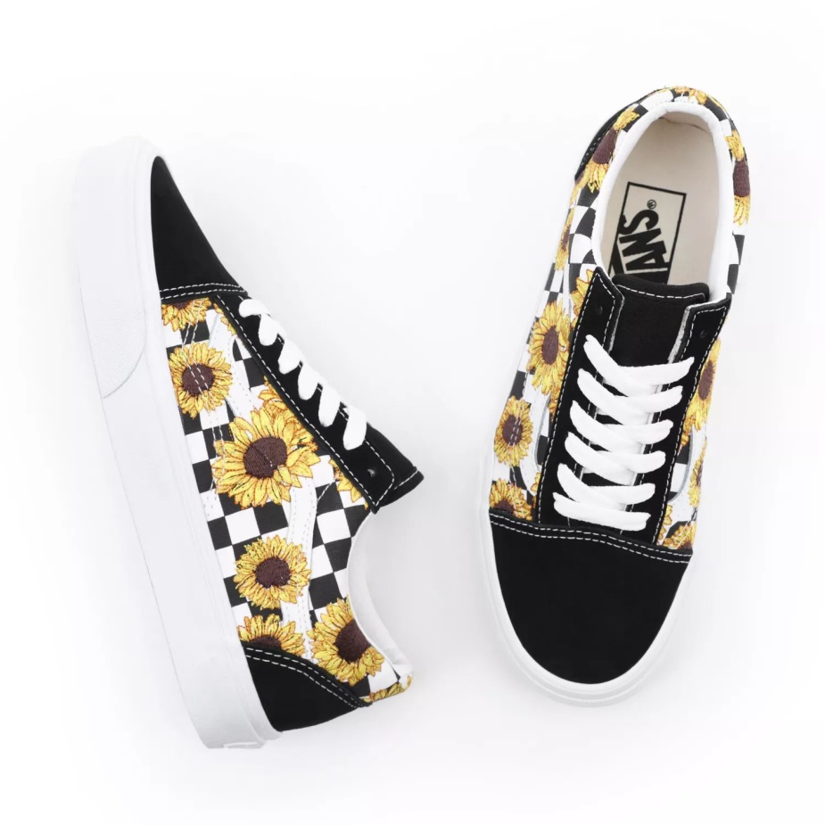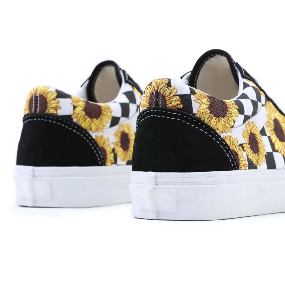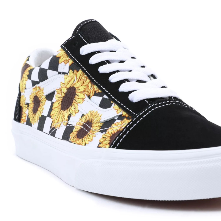 Το πρώτο που έφερε την εμβληματική πλαϊνή ρίγα, το παλιό Skool παπούτσι με κέντημα ηλίανθου είναι ένα χαμηλό κορυφαίο παπούτσι με κορδόνια. Είναι επενδεδυμένο, διαθέτει γιακά με επένδυση για άνεση, ενισχυμένα καλύμματα ποδιών για να αντέχουν την επαναλαμβανόμενη φθορά και διαθέτει την εξωτερική σόλα βάφλας με υπογραφή Vans για πιο σταθερό κράτημα. ένα ολόσωμο μοτίβο ηλίανθου και σκακιέρας ολοκληρώνει την εμφάνιση.