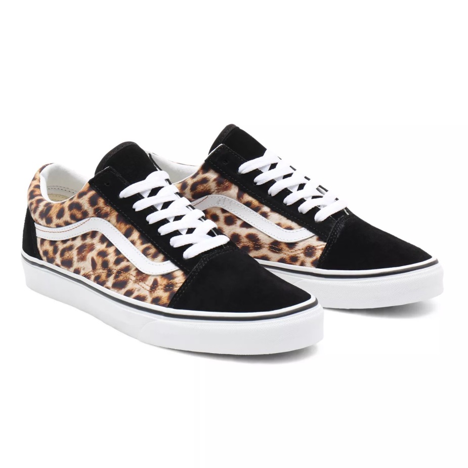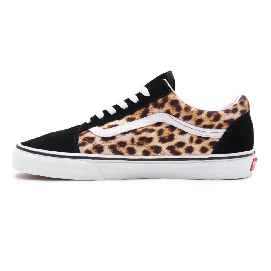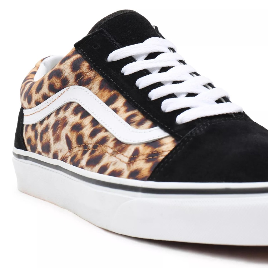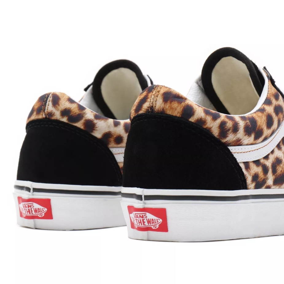 το Leopard Old Skool, το κλασικό Skate παπούτσι Vans και πρώτο που ξεγύμνωσε την εμβληματική πλαϊνή ρίγα, είναι ένα χαμηλό κορδόνι με στιβαρό σουέτ και υφασμάτινο επάνω μέρος με λεοπάρ στάμπα. Περιλαμβάνει επίσης ενισχυμένα καλύμματα στα δάχτυλα για να αντέχουν την επαναλαμβανόμενη φθορά, γεμισμένο κολάρο για στήριξη και ευελιξία και επώνυμες εξωτερικές σόλες από καουτσούκ βάφλα.