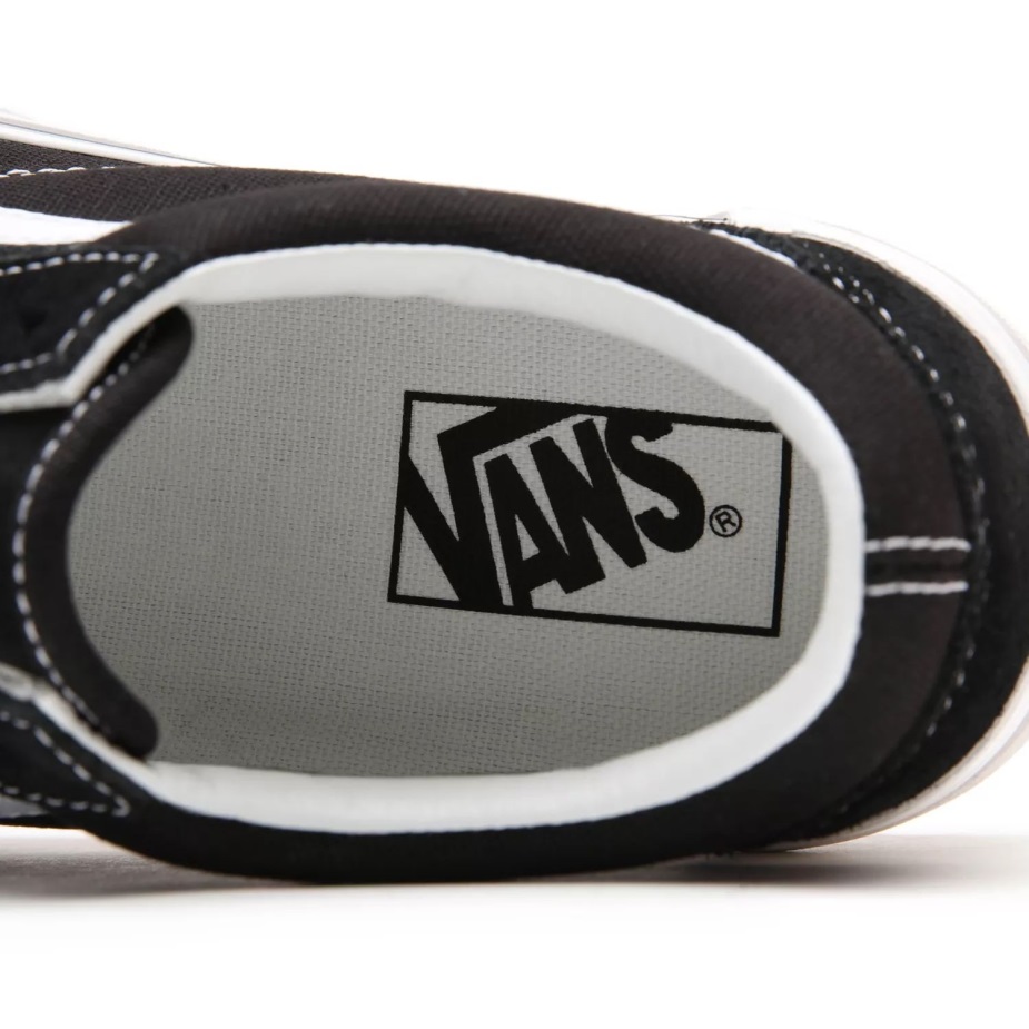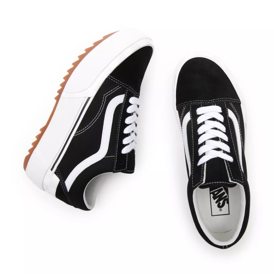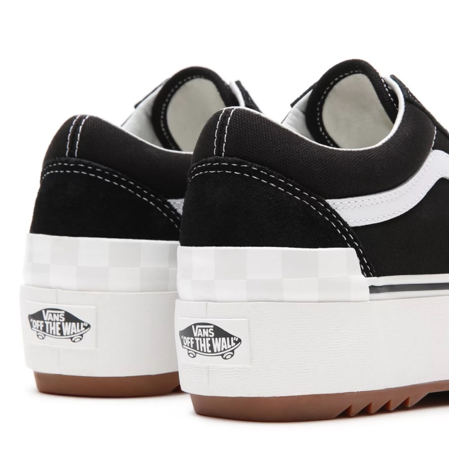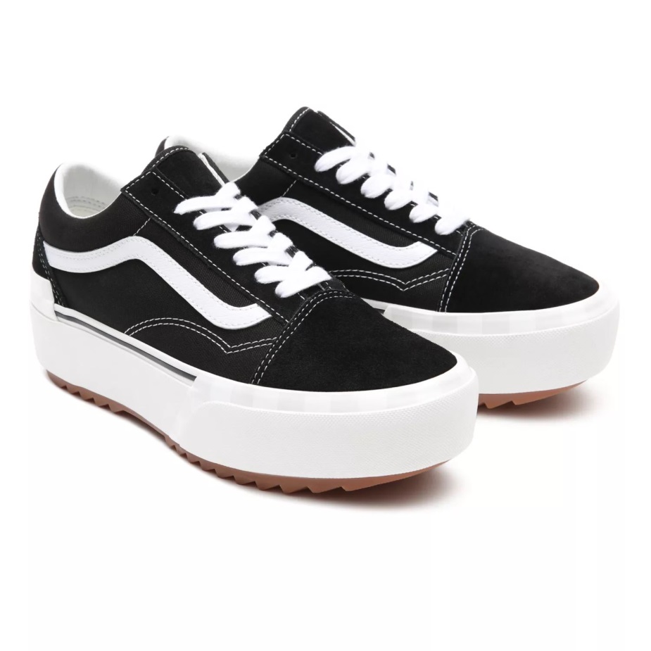Το πρώτο που φέρει την εμβληματική πλαϊνή ρίγα, το παλιό σκολάκι από σουέντ/καμβά Vans στοιβαγμένο είναι ένα χαμηλό κορυφαίο παπούτσι με κορδόνια. είναι επενδεδυμένο, διαθέτει γιακά με επένδυση για άνεση, ενισχυμένα καλύμματα στα δάχτυλα για να αντέχει την επαναλαμβανόμενη φθορά και διαθέτει την εξωτερική σόλα βάφλας τύπου Vans για πιο σταθερό κράτημα και μια εξωτερική σόλα πλατφόρμα.
