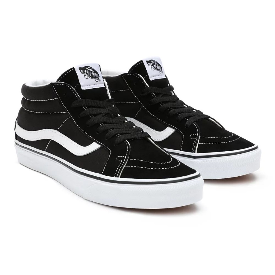 η επανέκδοση Sk8-mid, μια σιλουέτα στο μέσο της κορυφής εμπνευσμένη από το εμβληματικό επανακυκλοφορημένο Sk8-hi, διαθέτει στιβαρό καμβά και σουέτ επάνω μέρος, ενισχυμένους γιακά για στήριξη και ευελιξία, ενισχυμένα καλύμματα στα δάχτυλα για να αντέχουν την επανειλημμένη φθορά και επώνυμες σόλες από καουτσούκ βάφλα